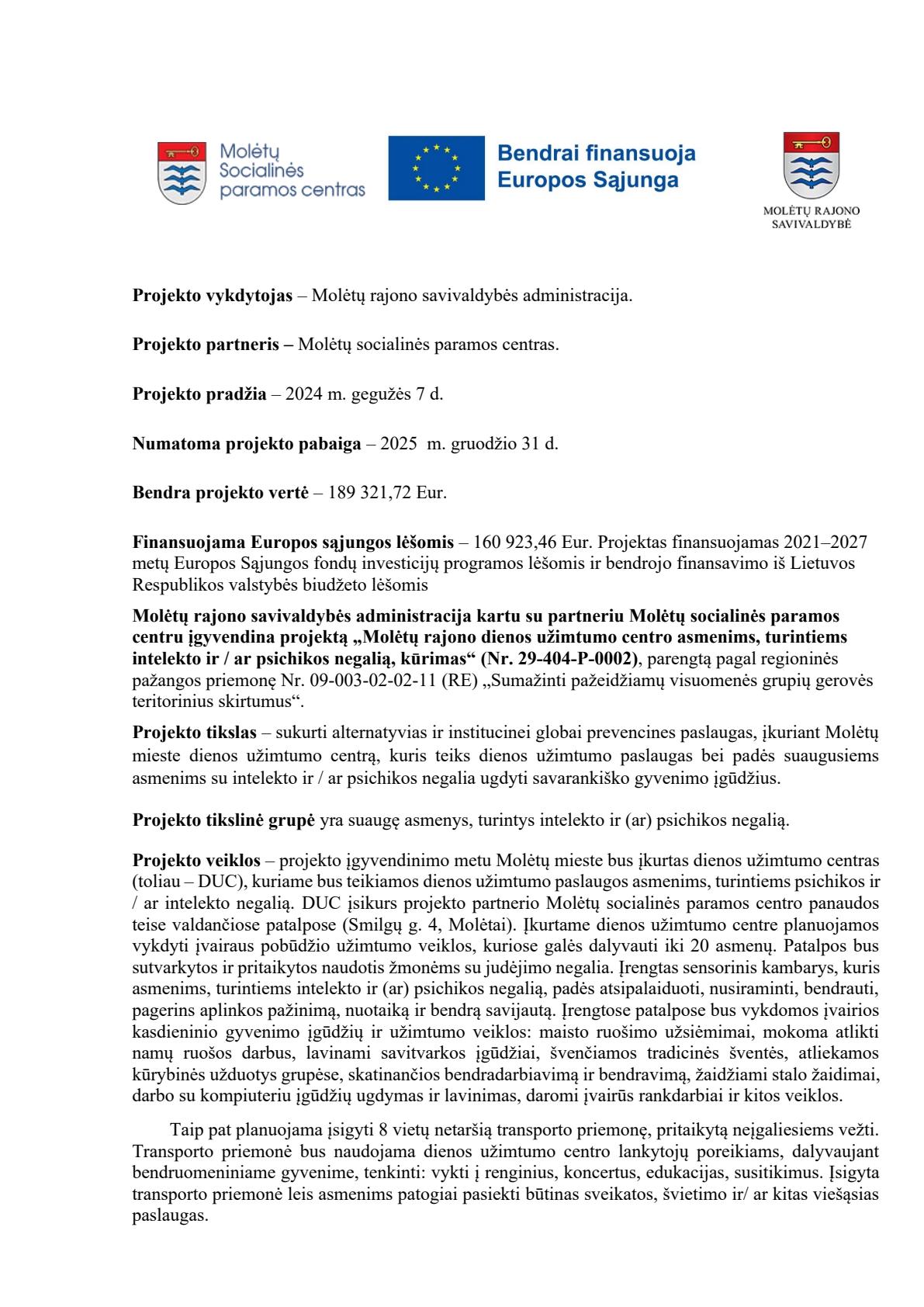 Projekto vykdytojas Molėtų socialinės paramos centras projektą vykdo kartu su partneriu Molėtų krašto žmonių su negalia sąjunga.